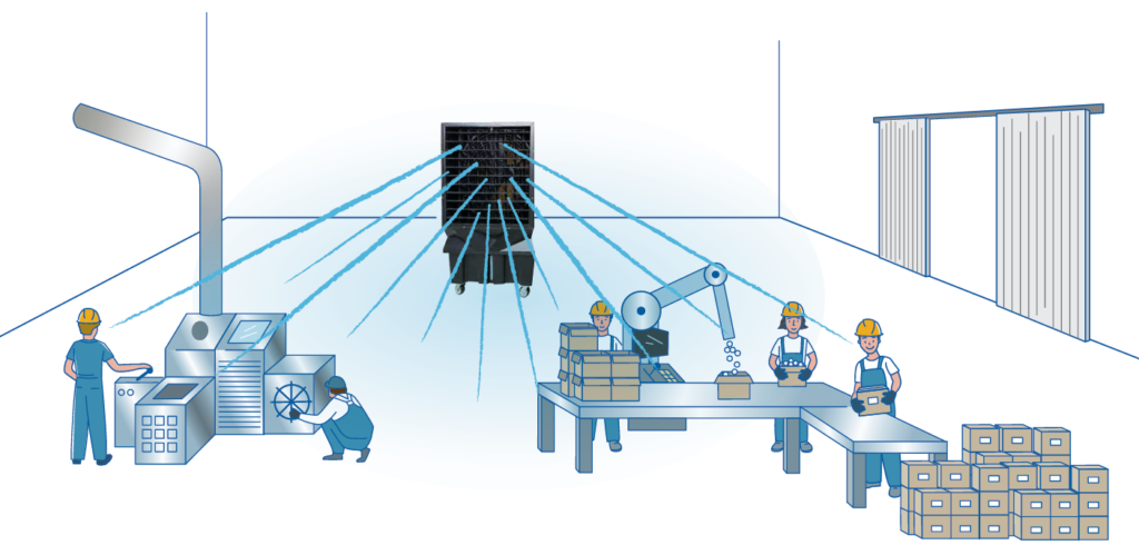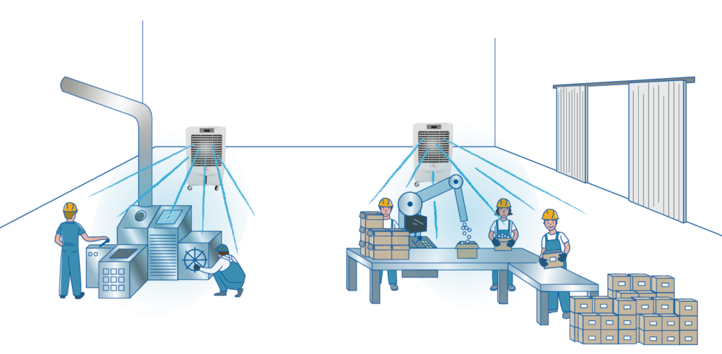 Si prefiere que cada grupo de trabajadores pueda «administrar» su evaporativo (distancia y dirección del flujo), mejor poner un equipo para cada sección.
