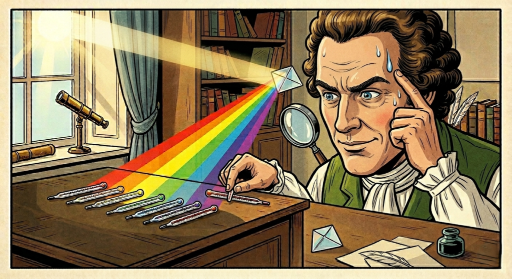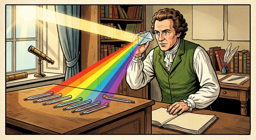 Todo comenzó en 1800, en el estudio del astrónomo Sir William Herschel. Mientras el mundo se conformaba con ver los colores del arcoíris, él decidió ir más allá: ¿podrían los colores tener su propia temperatura? Con un prisma de cristal y unos termómetros de mercurio, Herschel se dispuso a medir el calor oculto en la luz del Sol, sin sospechar que estaba a punto de encontrar algo invisible.