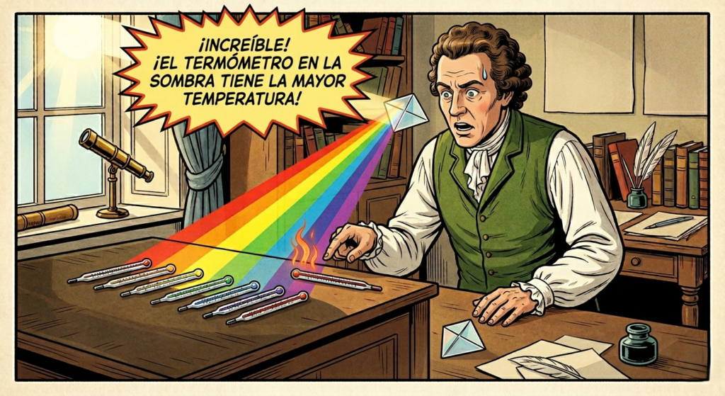 El experimento estaba en marcha. Herschel midió el violeta, el azul, el amarillo y el rojo… pero lo más fascinante ocurrió donde no había nada que ver. Colocó un termómetro de control justo al lado del color rojo, en la oscuridad absoluta de la mesa, convencido de que allí la temperatura sería la más baja. Sin embargo, para su asombro, el mercurio empezó a subir con más fuerza que en cualquier otro color. ¡Había descubierto una fuente de calor oculta a los ojos humanos!