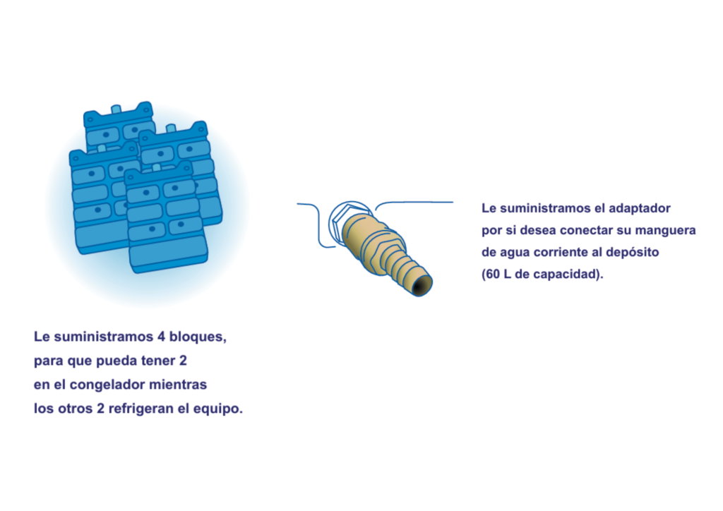 VENTA: €1.670,00 + IVA incluye: 4 paquetes de hielo sintético, 1 adaptador de ingreso al aparato para la manguera, transporte, seguro en caso de daños durante el transporte, 1 año de garantía.)