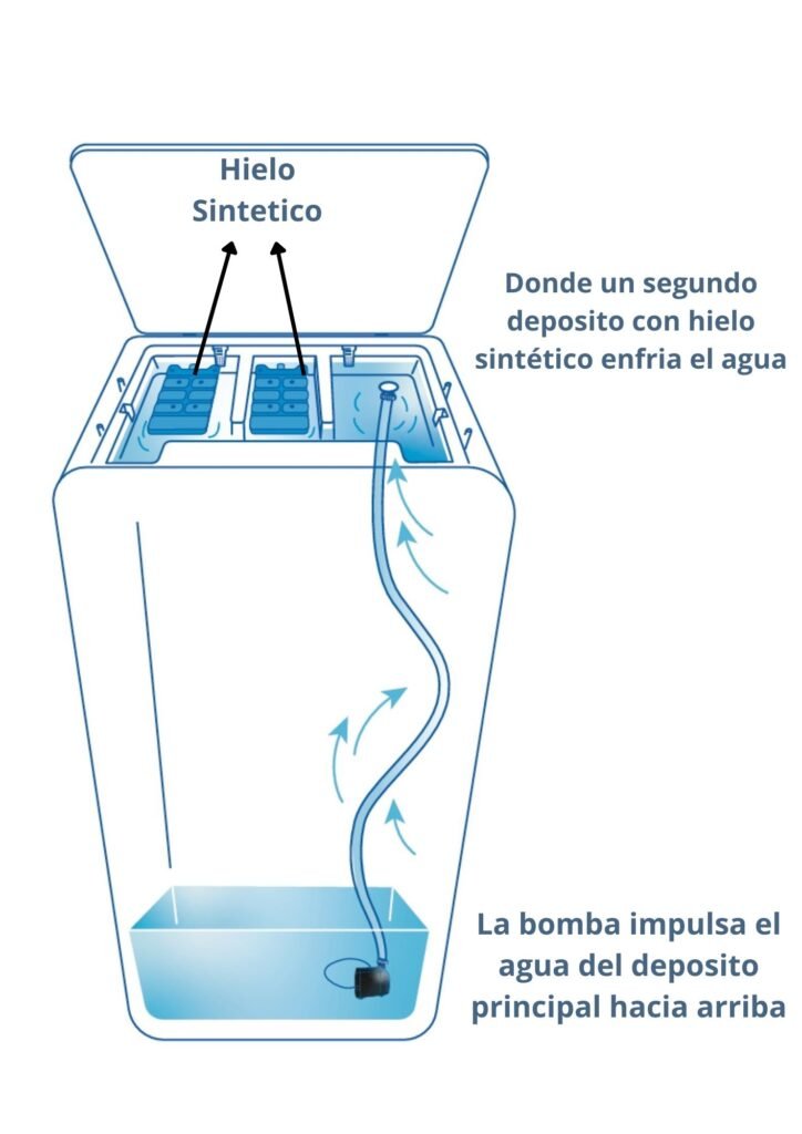 Nuestro Raffy 13 posee una característica única que lo distingue de cualquier otra unidad en el mercado, incluso de las nuestras. Hemos desarrollado y patentado una tecnología revolucionaria para asegurar un rendimiento superior en su categoría: mediante una bomba, el agua se impulsa desde el tanque principal hacia un segundo depósito de menor tamaño. Allí, gracias al uso de hielo sintéticose logra un enfriamiento mucho más intenso y rápido.